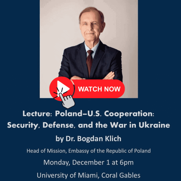 Lady Blanka Rosenstiel Endowed Program in Polish Heritage at University of Miami presents the following lecture: 📹 Event Recap | Dr. Bogdan Klich – Poland–U.S. Cooperation: Security, Defense & the War in Ukraine This video captures the full public lecture by Dr. Bogdan Klich, presented at the Great Hall, Frost Institute for Chemistry and Molecular Science at...Watch Now »
