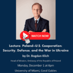 Lady Blanka Rosenstiel Endowed Program in Polish Heritage at University of Miami presents the following lecture: 📹 Event Recap | Dr. Bogdan Klich – Poland–U.S. Cooperation: Security, Defense & the War in Ukraine This video captures the full public lecture by Dr. Bogdan Klich, presented at the Great Hall, Frost Institute for Chemistry and Molecular Science at